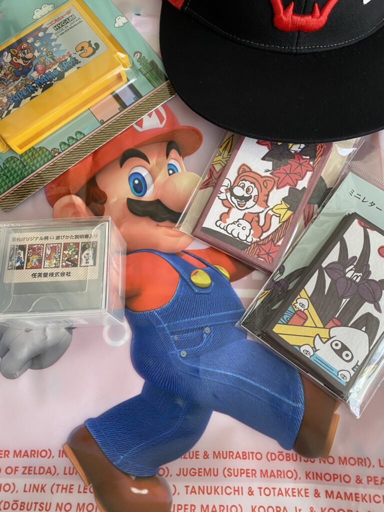 マリオ花札と、マリオ花札柄のミニレターと、ファミコンカセット型のメモを買いました。最高ですね。